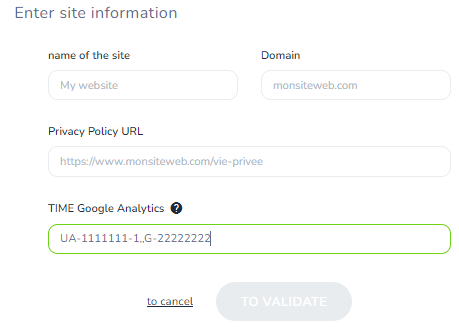 Once the account is created, you will be able to declare your website(s) and corresponding tags, i.e. the Google Analytics property identifiers you have written aside in the first step of this guide, in the form UA-XXXXXX-Y or G-XXXXXX.